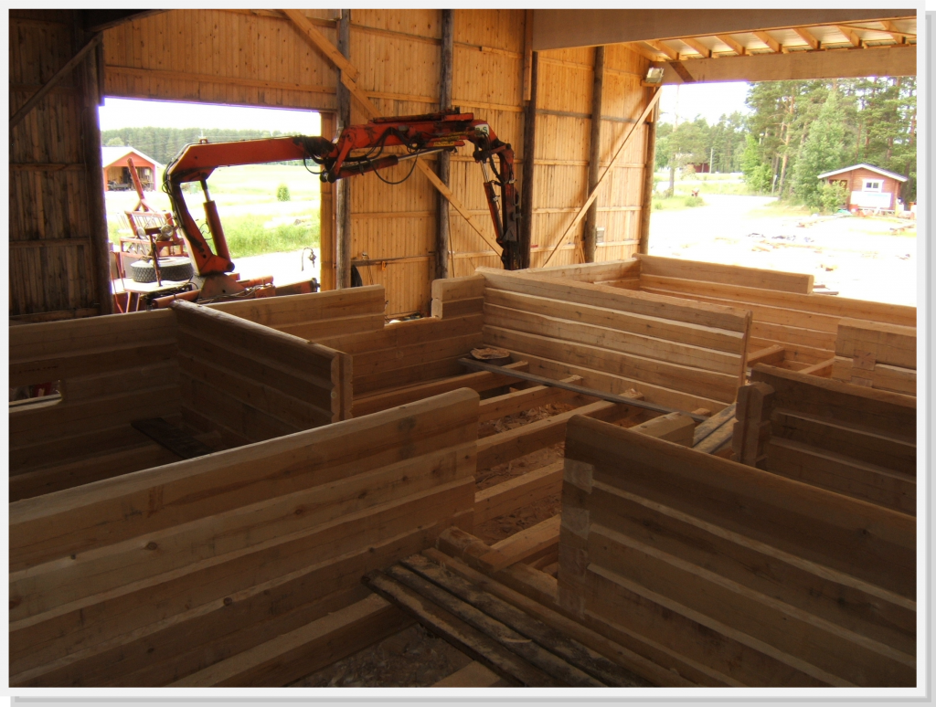 Hirsien kuivuttua kehikoiden valmistus tehdään veistohalleissa säältä suojassa.